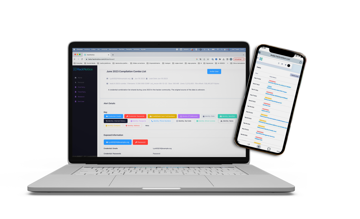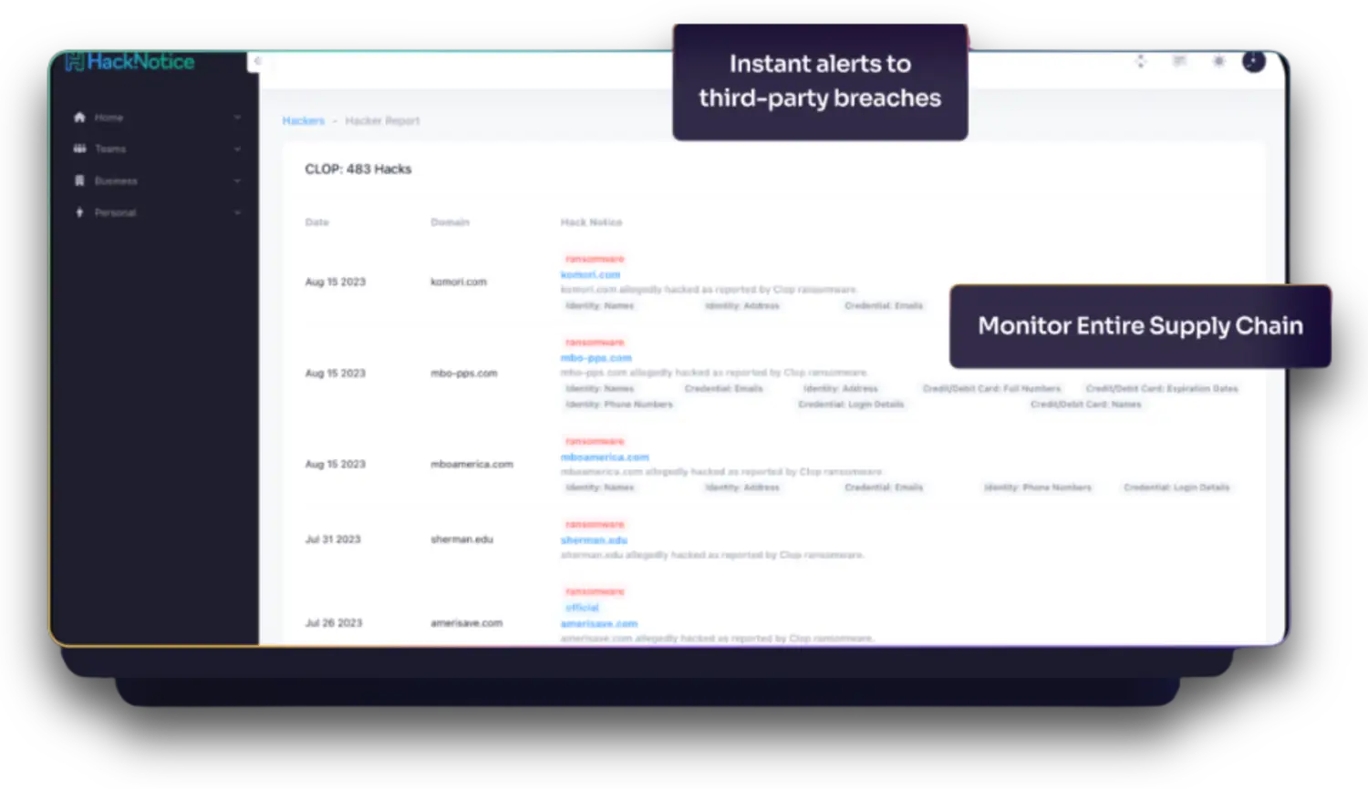 HackNotice is a leading dark web threat intelligence platform that helps organizations identify, understand, and act on digital risks across their entire ecosystem — employees, vendors, and customers. With real-time monitoring, customizable alerting, and deep visibility into breached and trafficked data, HackNotice makes it simple for security teams to proactively prevent attacks, respond faster to incidents, and reduce overall risk exposure. From infostealer malware detection to third-party compromise alerts, HackNotice delivers tailored insights that drive action — all through a unified, scalable platform built for modern threat defense.