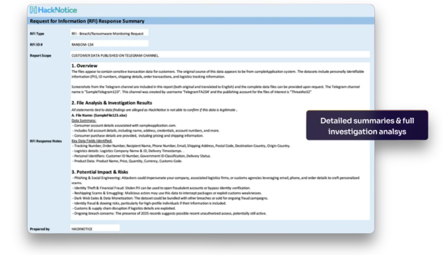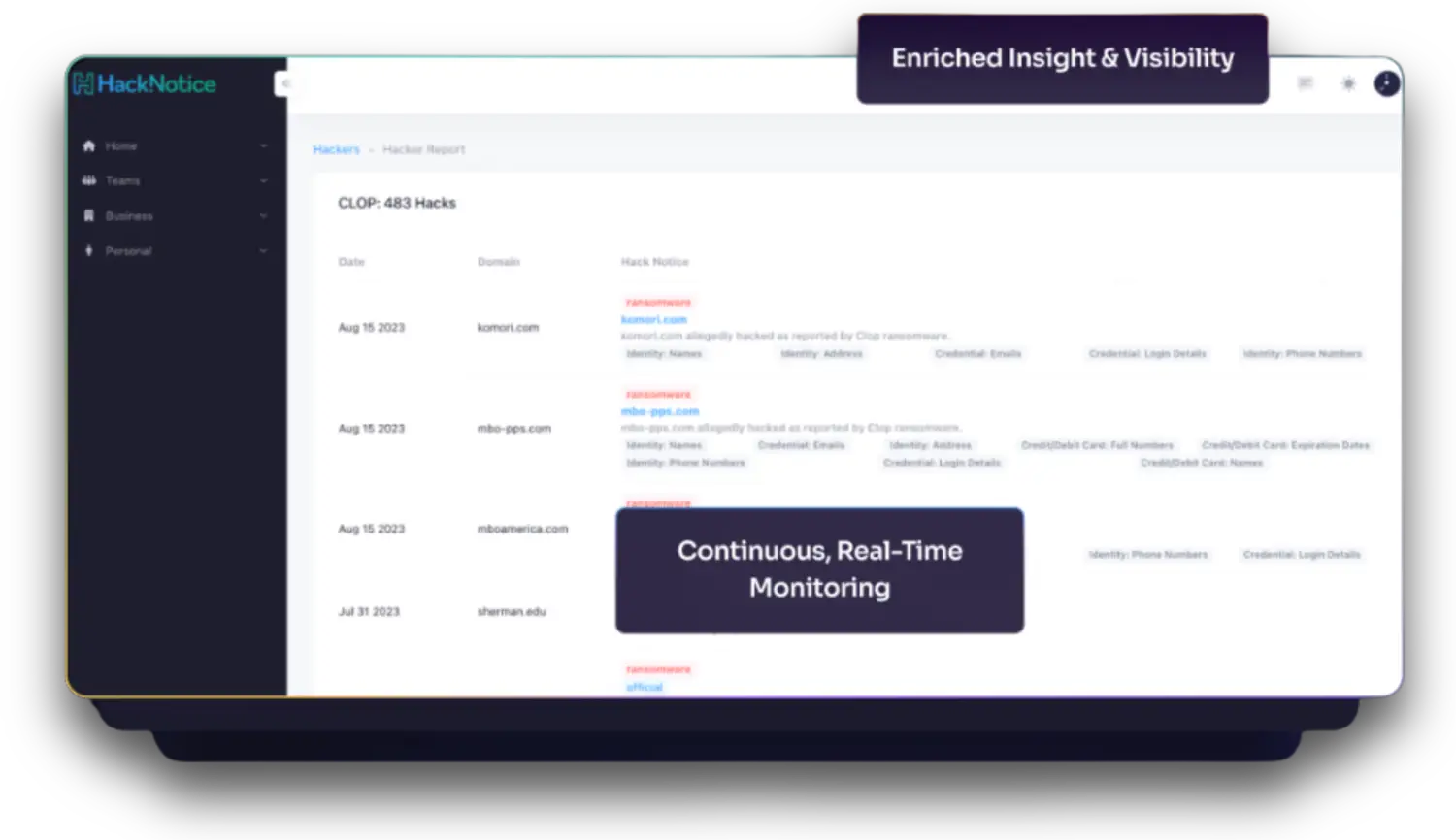 HackNotice delivers end-to-end dark web threat coverage — from third-party breaches and ransomware to individual exposed credentials, executive PII, and sensitive data (financial data, API keys, etc.). With modular services and built-in investigation tools, you get the visibility and speed to act across your entire risk surface.