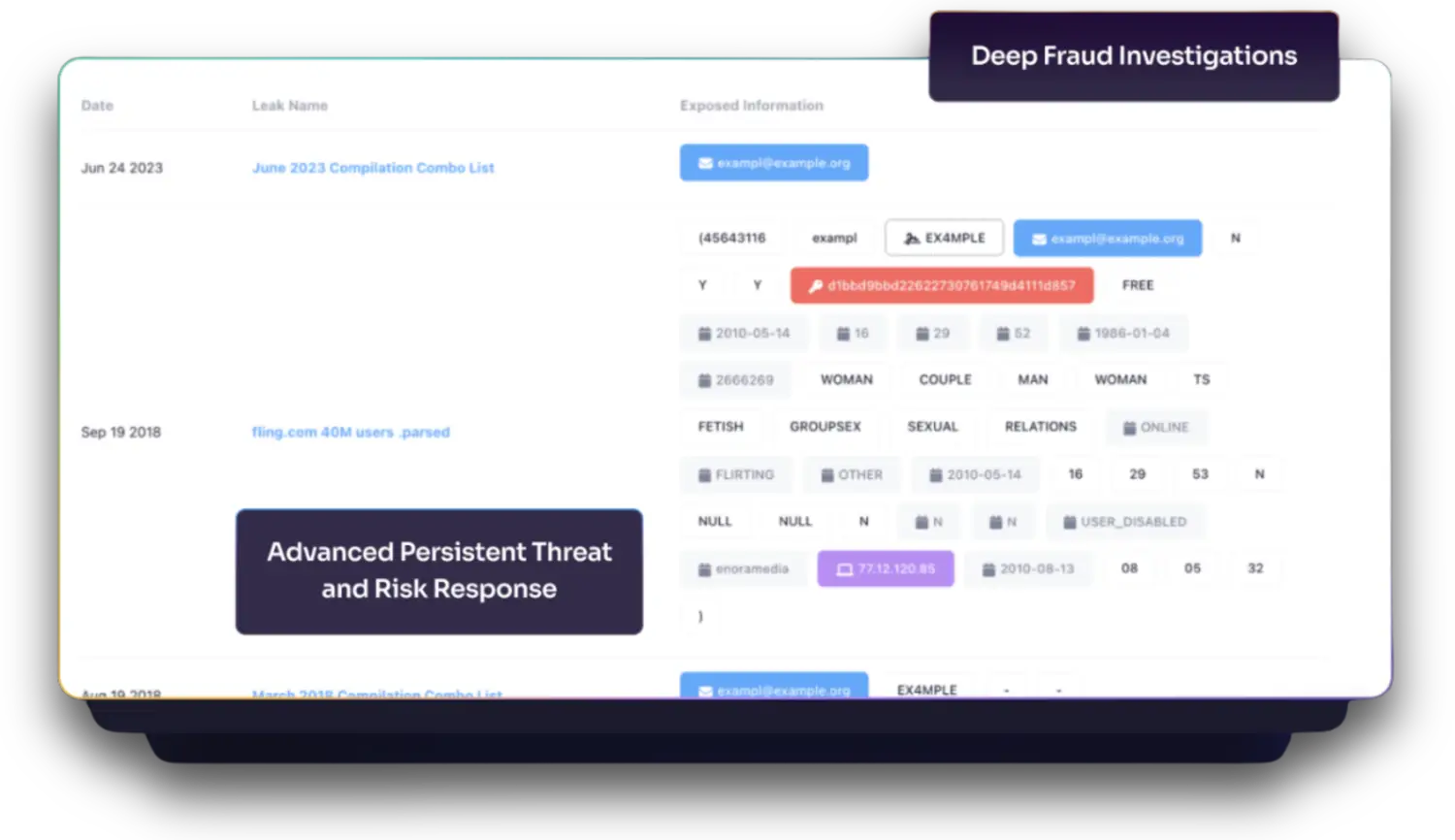 Rapidly detect exposed passwords and data tied to any email address, username, and more. Boost your ability to respond to threats rapidly with around-the-clock real time alerting.